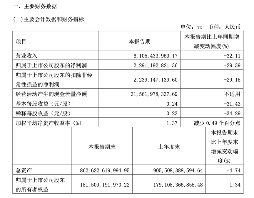 据华泰证券2024年一季报显示,该公司报告期内的总营业收入约合61.05亿元,相较去年同期89.93亿元下降了32.11%。归属于上市公司股东的净利润约合22.91亿元,同比减少29.39%。这一下降主要受到投资业务收入减少的影响。需要关注的是,截止本报告期末,华泰证券总资产8626.23亿元,比上年度末的9055.08亿元减少了4.74%。